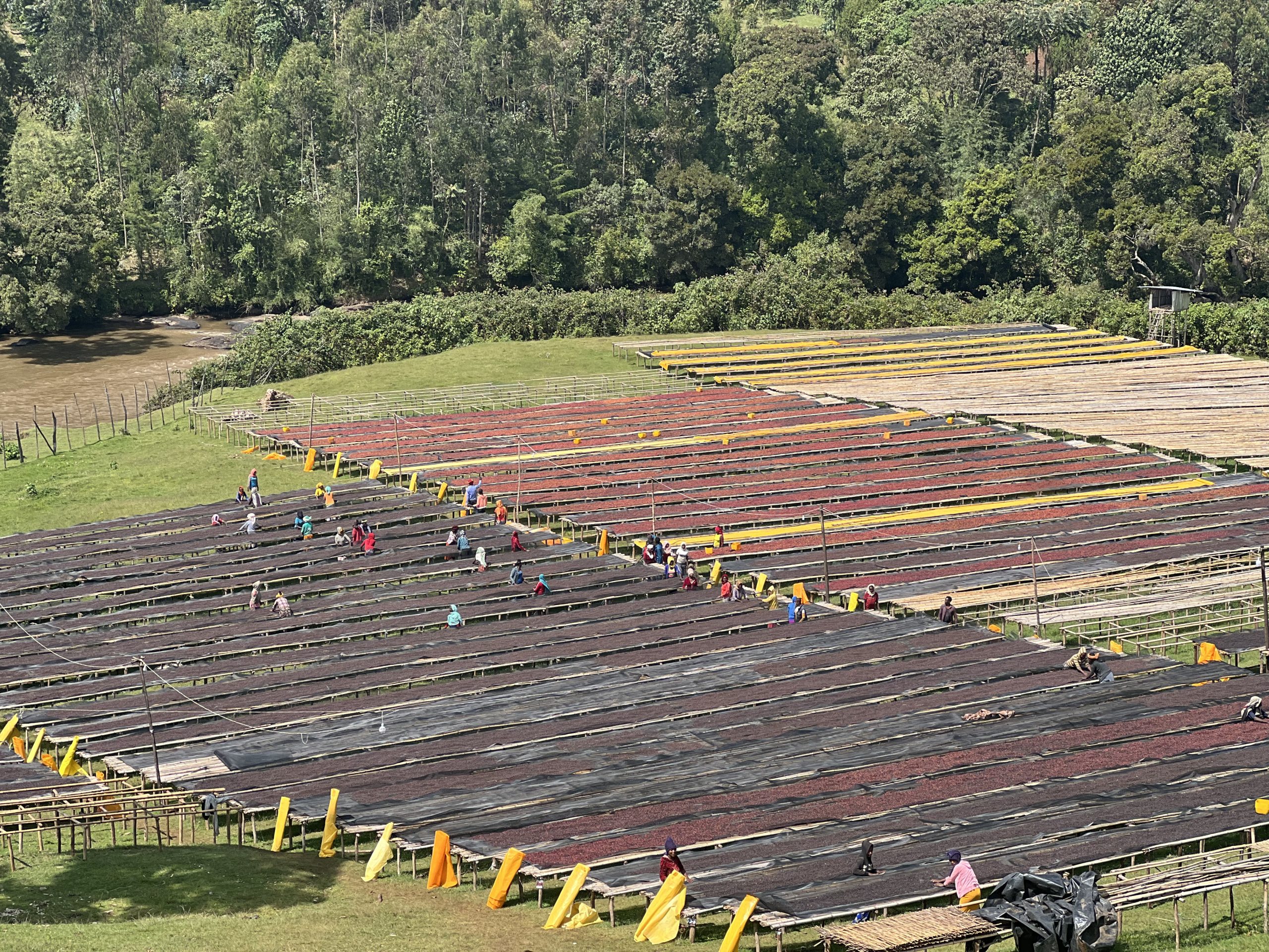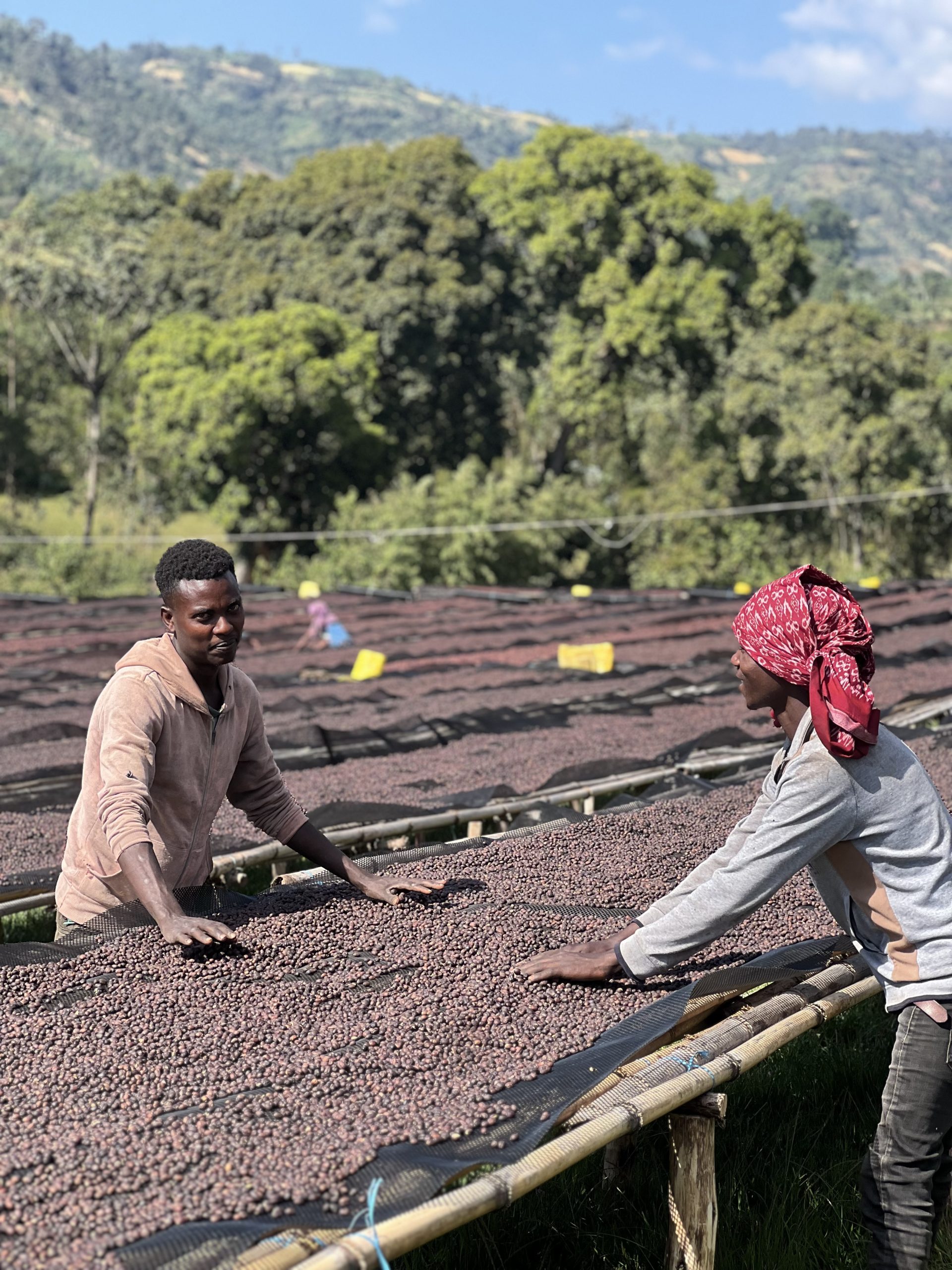 For this lot, at the washing station, cherries are preselected. They are then immersed in a water tank to remove floaters, unripe, overripe, and defective cherries. After the separation, coffee cherries are laid into 25 kg batches with a thickness of 5cm onto the dry African bed, where Testi’s team turns over the cherries 5 to 6 times a day to make sure of even sun exposure. Once the pod reaches an adequate moisture level of 11% to 12% content, which can be reached within 15 to 21 days depending on the weather conditions, then they relocate the lot to the nearest warehouse for storage.